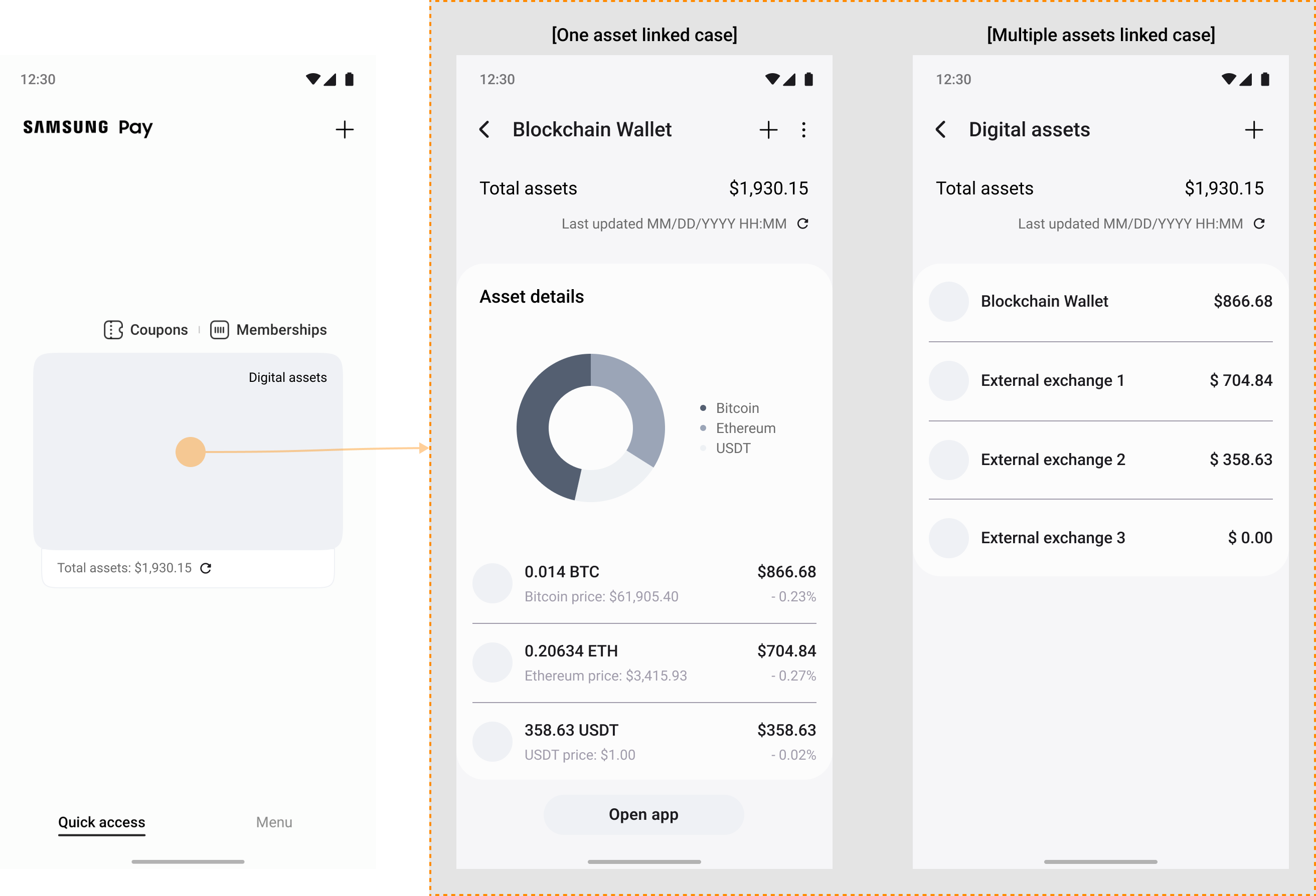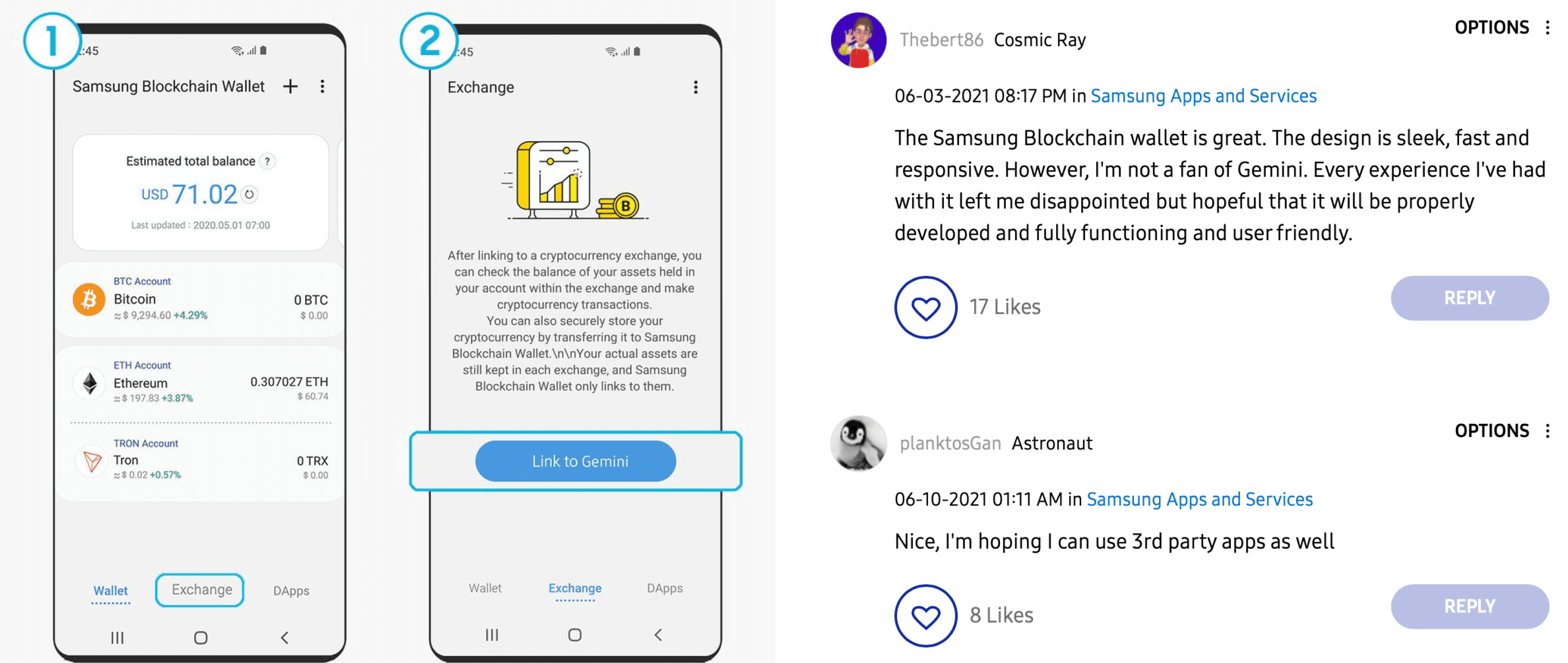 Samsung Wallet also enables users to monitor total cryptocurrency values across multiple significant exchanges. Since the list of supported partners is wider than Blockchain Wallet and with the support of various promotions in Korea, nearly 10% of Samsung Wallet users have added at least one external exchange to their portfolio. The list of exchanges varies by country and is expected to grow over time.